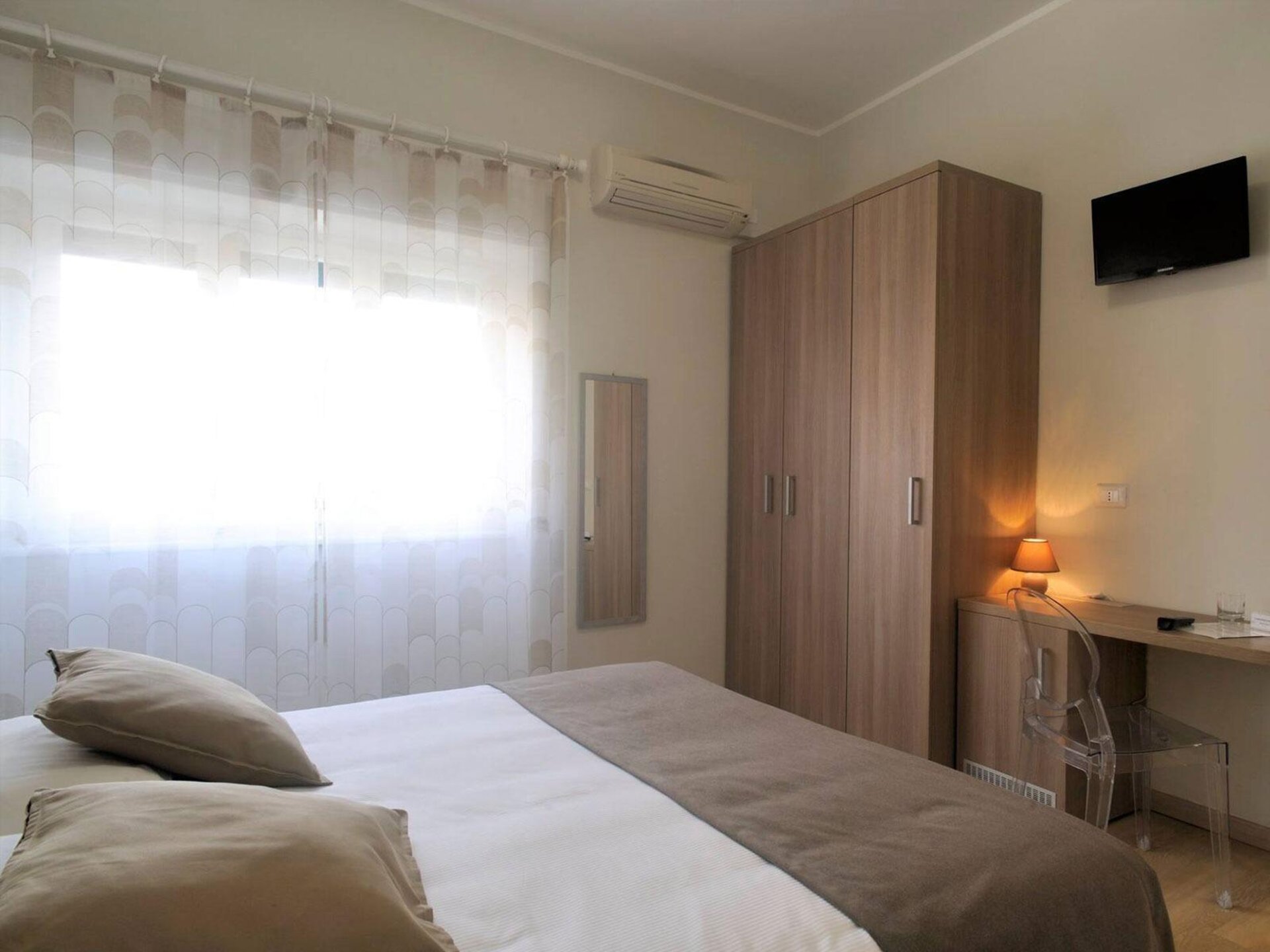 Le camere dell’hotel sono site su tre piani serviti da ascensore; lo stile è moderno ma caldo e accogliente, con i confort per una vacanza in relax o uno stop di lavoro: wi-fi, tv, condizionatore autonomo, telefono, cassaforte e phon. In un’ottica più eco friendly abbiamo tolto i saponi e gli shampoo monouso installando dei dispenser più green. La pulizia e il riassetto delle camere è giornaliero e accurato e con i prodotti certificati per la migliore igienizzazione possibile garantendo così un soggiorno più sicuro. Alcune stanze hanno affaccio su strada o sul fianco, con il balcone, mentre le altre hanno vista sul retro dell’hotel ma non hanno un’ area esterna. Per chi viaggia con i bimbi piccoli non si deve occupare di nulla: abbiamo tutto il necessario a disposizione dal lettino al seggiolone.